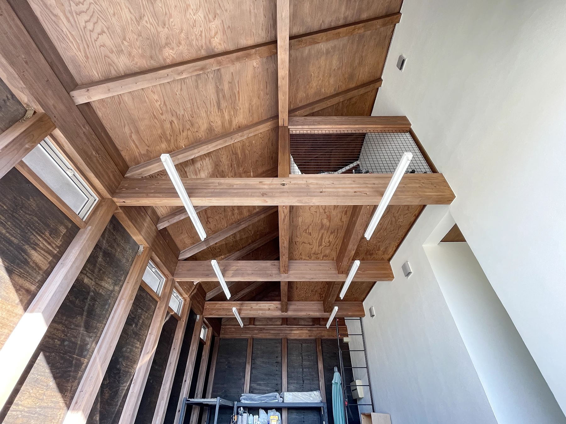 新築時はナチュラルな色だったガレージの柱や梁も変色してきたので、今回はブラウン系に塗装。落ち着いた雰囲気のガレージに変わりました。